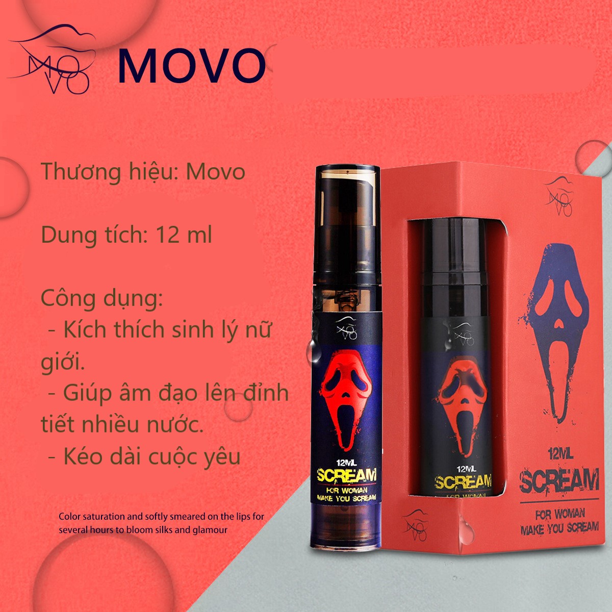Gel Movo Scream còn là loại gel bôi trơn tăng khoái cảm tình dục cho phụ nữ, Movo Scream kích thích âm đạo khiến chị em phải hét lên trong sung sướng. Khi sử dụng Movo Scream Gel âm đạo sẽ ngay lập tức cảm thấy thoải mái với cực khoái của bạn hơn trước. Các cơn co thắt nhanh hơn, hưng phấn hơn, khiến phụ nữ cảm thấy thoải mái tự do cho đến khi họ đạt đến đỉnh cao la hét vì sung sướng